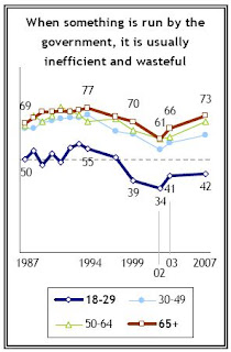 According to a Pew Research report, Millennials are markedly less cynical than older generations — at least as far as putting faith in government and business institutions. A full 82 percent of 18- to 29-year-olds agree with the statement, “the strength of this country is mostly based on the success of American business”. Agreement with this statement among Millennials actually increased 5 percentage points over the past four years. In contrast, agreement among other age groups is much lower and has decreased. The gap is even more pronounced when it comes to perception of government. Just 42 percent of people under 30 agree with the statement, “When something is run by the government, it is usually inefficient and wasteful”, compared to 62 percent overall (see chart).