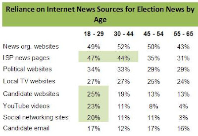 • There is no age difference in likelihood of relying on candidate email, political web sites and local TV web sites.