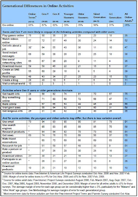 This chart was taken from Pew’s Internet’s just released report, “Generations Online”. It does a great job of comprehensively mapping out the differences in online usage across age groups. A graph is worth a thousand words so I won’t spell out every observation here (click the chart to enlarge), but it’s interesting how each generation has its own defining way of using the web. For teens it’s gaming, for Gen Y it’s video and social networking, for Gen X it’s online shopping. Also of note, is how many activities they have in common.
