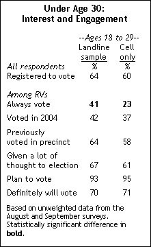 There’s universal agreement that the youth vote is critical to the outcome of the 2008 election, but how engaged are Millennials? Engagement is a tricky thing to measure, but just released data from Pew Research sheds some light. First, the table shows a strong trend among 18-24 year olds for going ‘newsless’; 34% say they watch no news on a daily basis, up from 25% in 1998. (Presumably news on the Comedy Channel doesn’t count as ‘news’, although I’m not sure.) While over 9 out of 10 18-29 year olds say they intend to vote, only 7 out of 10 say they ‘definitely plan to vote’ and less than two thirds say they voted in their precinct last time they had a chance, and only 4 out of 10 say they ‘always’ vote. These figures are even lower for ‘cell phone only’ respondents.