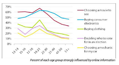 The Rubicon report emphasizes that far from being a problem to be solved, the fact that most web communities are dominated by a few active voices and a lot more ‘voyeurs’ is something marketers can leverage by targeting MFC’s. There really are influencers – a lot of people are reading the opinions of MFC’s and using them in their purchasing decisions across a variety of product categories, especially electronics, vacations, movies, restaurants and jobs. The chart below shows that this is especially true for Millennials. For nearly every category, the influence of online word of mouth is strongest for those 18-22.